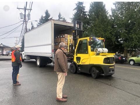 Don Swanson, CEO of Plywood Supply volunteered a forklift and a driver to unload the food palettes from the semi trucks.